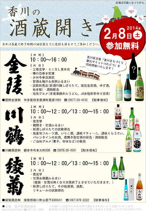 ホーム › お知らせ › 香川県の酒蔵開きのご案内(予約・申込み不要!)です。